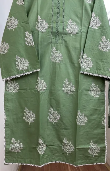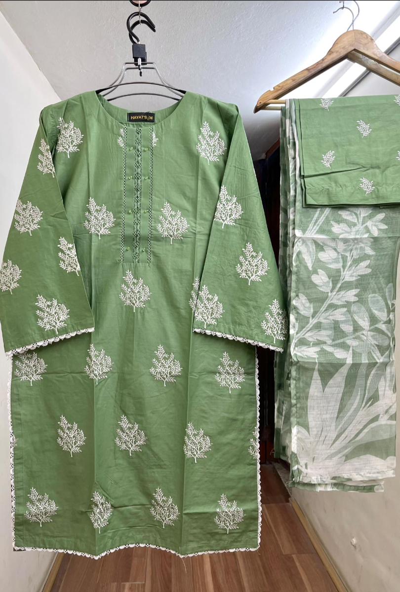 Pakistani Original Hayat’s Embroidered Stitched Cotton 3Pcs, Embroidered Shirt With Stone, Embroidered work & Embroidered Borders On Sleeves & Printed Moysorii Cotton Dupatta & Cotton Pant