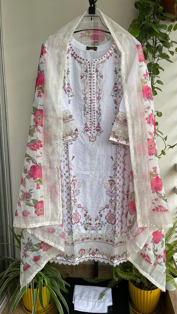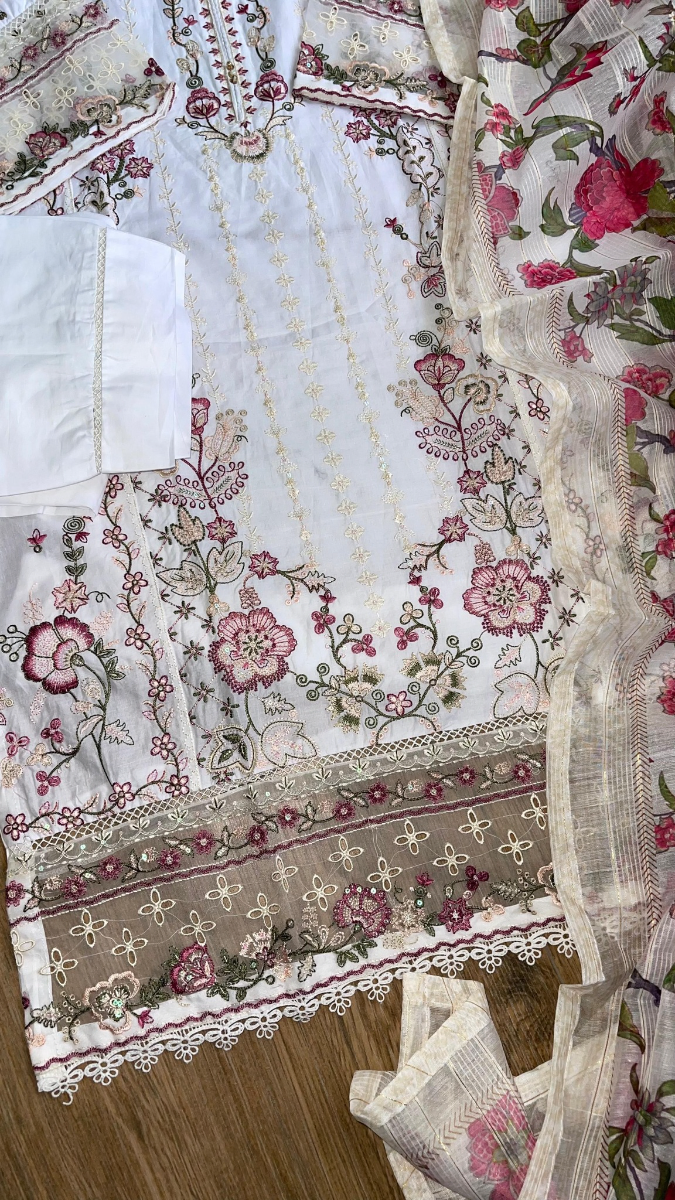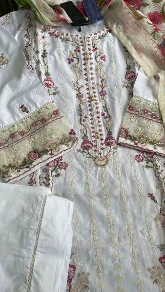 Pakistani Original Hayat’s Embroidered Stitched Cotton 3Pcs, Full Embroidered Shirt With Sequin, Mirror work, Lacework & Embroidered Borders On Sleeves & Printed Moysorii Cotton Dupatta & Cotton Pant