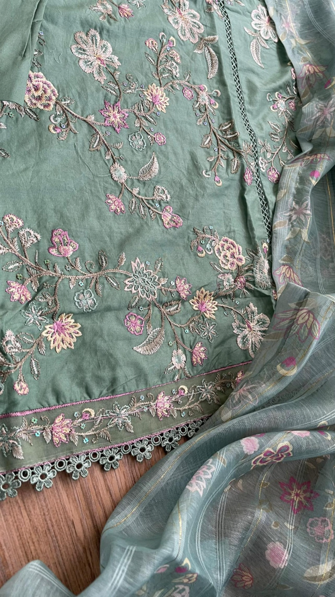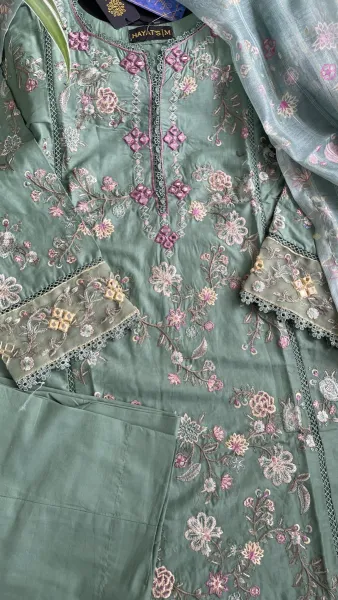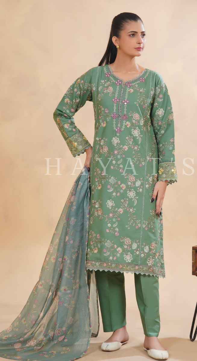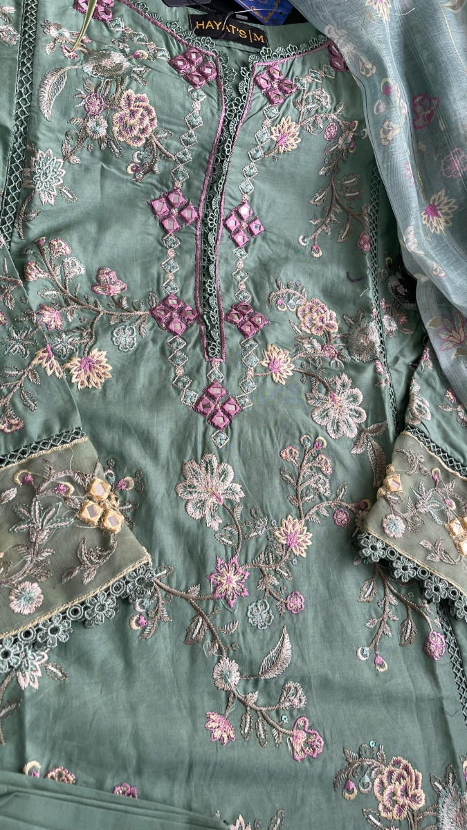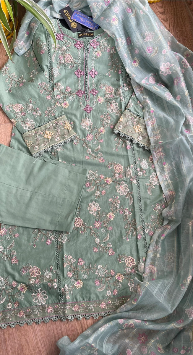 Pakistani Original Hayat’s Embroidered Stitched Cotton 3Pcs, Full Embroidered Shirt With Sequin, Mirror work, Lacework & Embroidered Borders On Sleeves & Printed Moysorii Cotton Dupatta & Cotton Pant