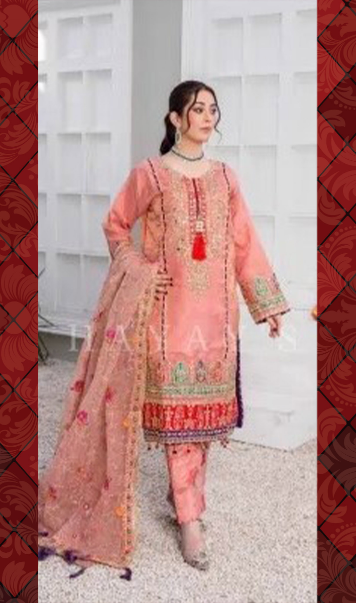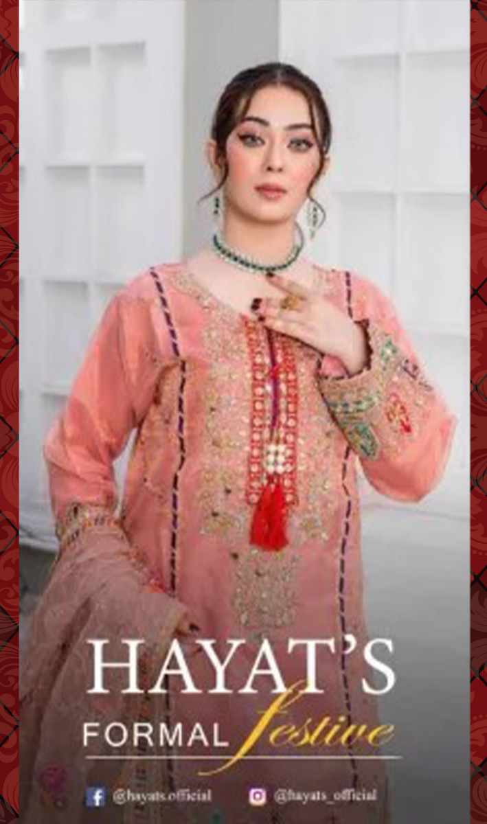Pakistani Original Hayat's Luxury Organza Stitched 3Pcs, Embroidered Shirt With Sequin, Mirror Work, Tassel & Embroidered Organza Dupatta & Embroidered Borders On Sleeves & Organza Net Pant