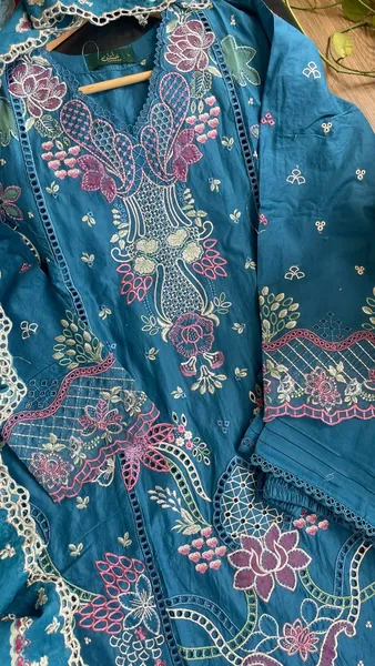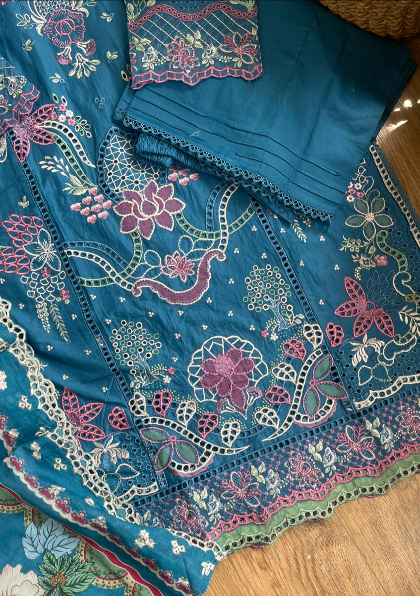 Embroidered Shirt With Chikankari Work, Neckline Lacework & Embroidered Lawn Dupatta & Embroidered Borders On Sleeve With Cotton Pant