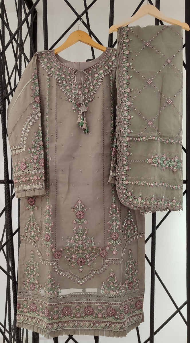 Pakistani Original HZ Luxury Formal Organza Stitched 3 Pcs, Embroidered Shirt With Sequin, Parl&Ston Work, Tarsel, Embroidered Borders On Sleeves With Sequin, Parl, Ston, Embroidered Organza Dupatta With Sequin & Silk Pant
