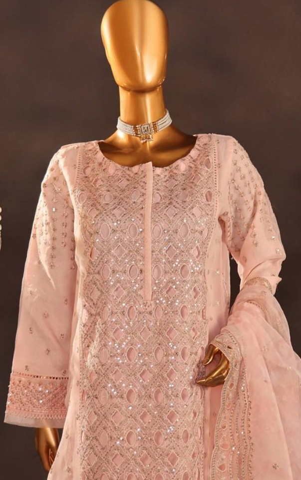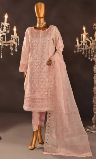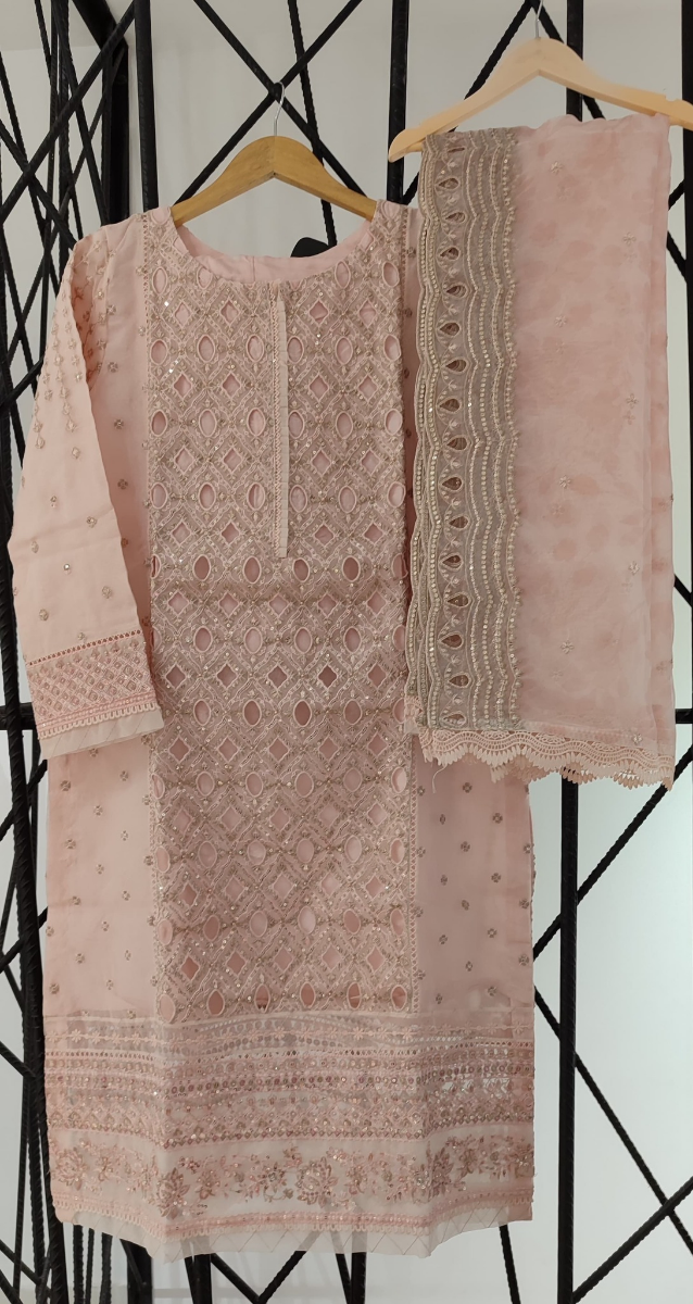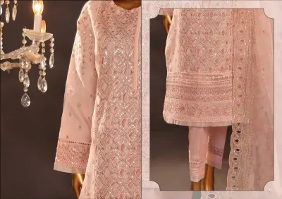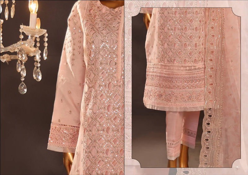 Pakistani Original HZ Luxury Formal Organza Stitched 3 Pcs, Embroidered Shirt With Sequin, Parl&Ston Work, Embroidered Borders On Sleeves With Sequin, Parl, Ston, Embroidered Organza Dupatta With Sequin & Silk Pant