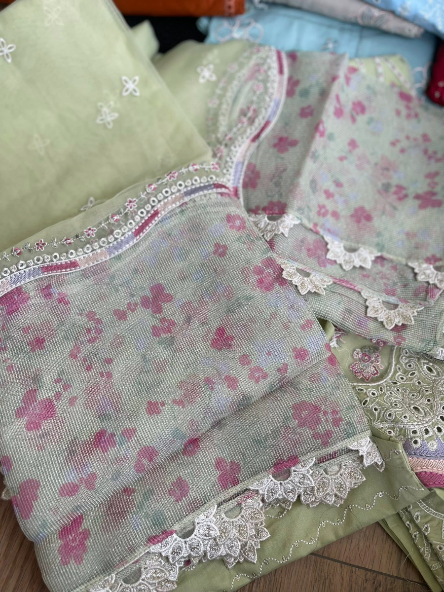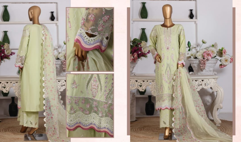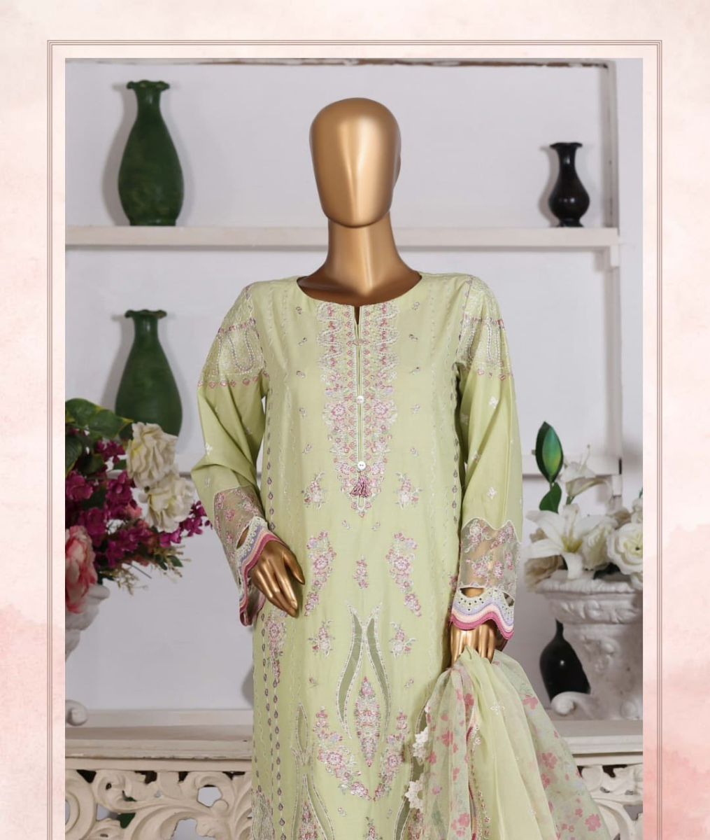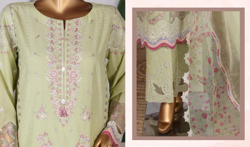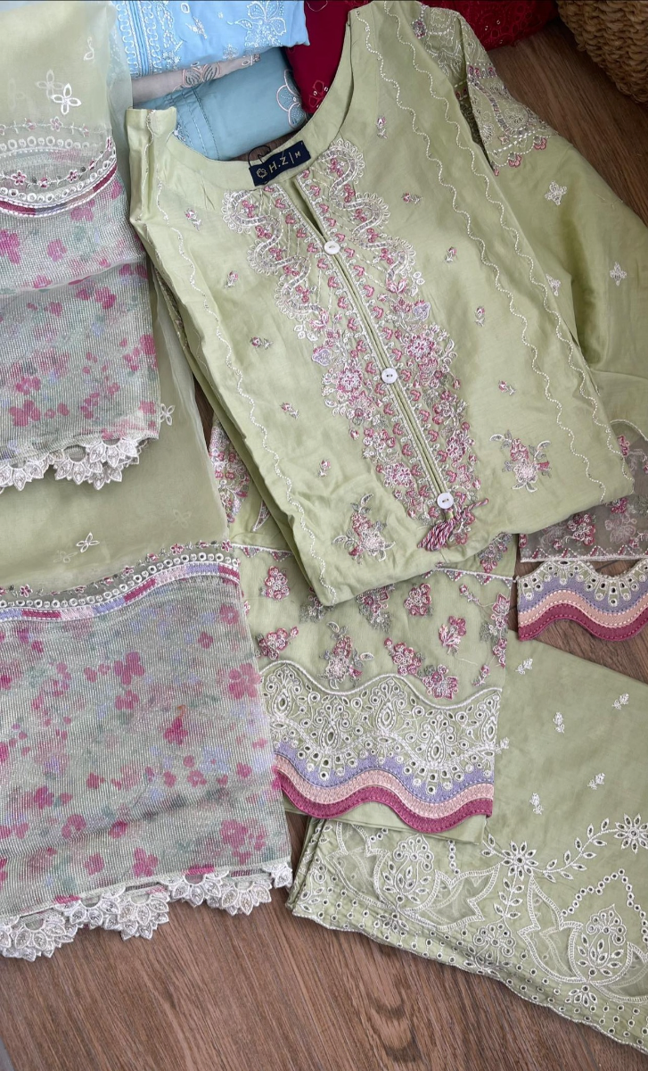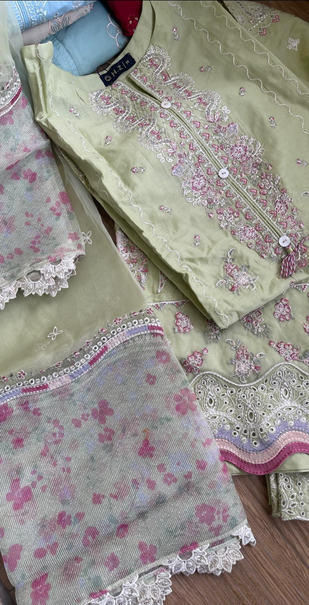 Pakistani Original HZ Textiles Luxury Cotton Stitched 3Pcs, Embroidered Shirt With Sequin, Tassel, Batton & Embroidered Organza Net Dupatta & Embroidered Borders On Sleeve & Cotton Pant