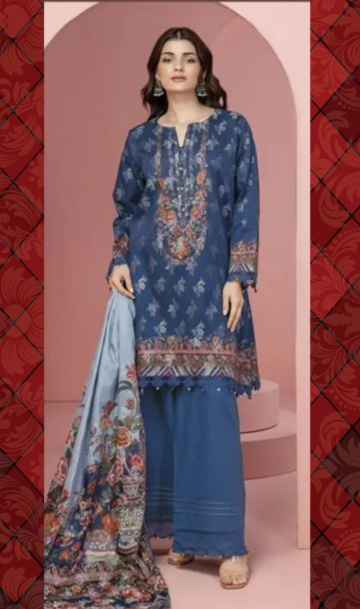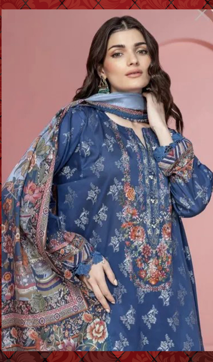 Pakistani Original Khaadi Stitched 3Pcs, Embroidered Printed Shirt With Sequin Work, Cotton Printed Dupatta & Embroidered Borders On Sleeves & Cotton Pant