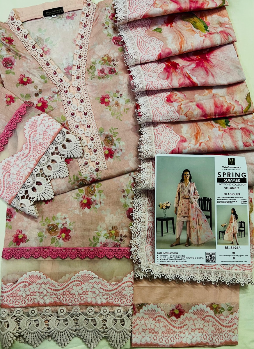 Pakistani Original Mausummery Cotton Stitched 3 Pcs, Printed Embroidered Shirt With Parl, Tarsel, Borders On Sleeves, Printed Cotton Dupatta & Cotton Pant