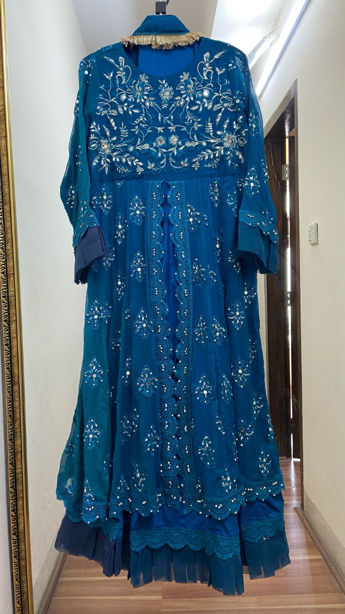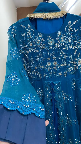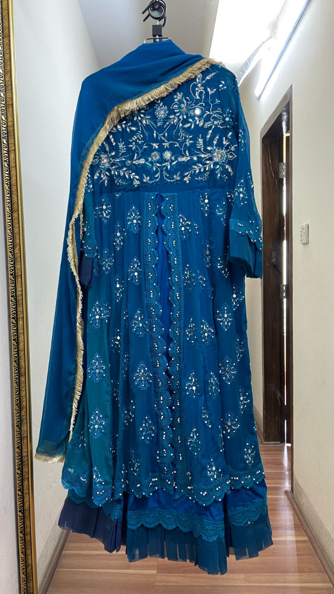 Pakistani Original Mona Embroidery Chiffon Stitched Gown 3 Pcs, Full Embroidered Shirt With Sequin, & Stone, Mirror Work & Embroidered Borders On Sleeves With Sequin, Embroidered Chiffon Dupatta & Silk Pant