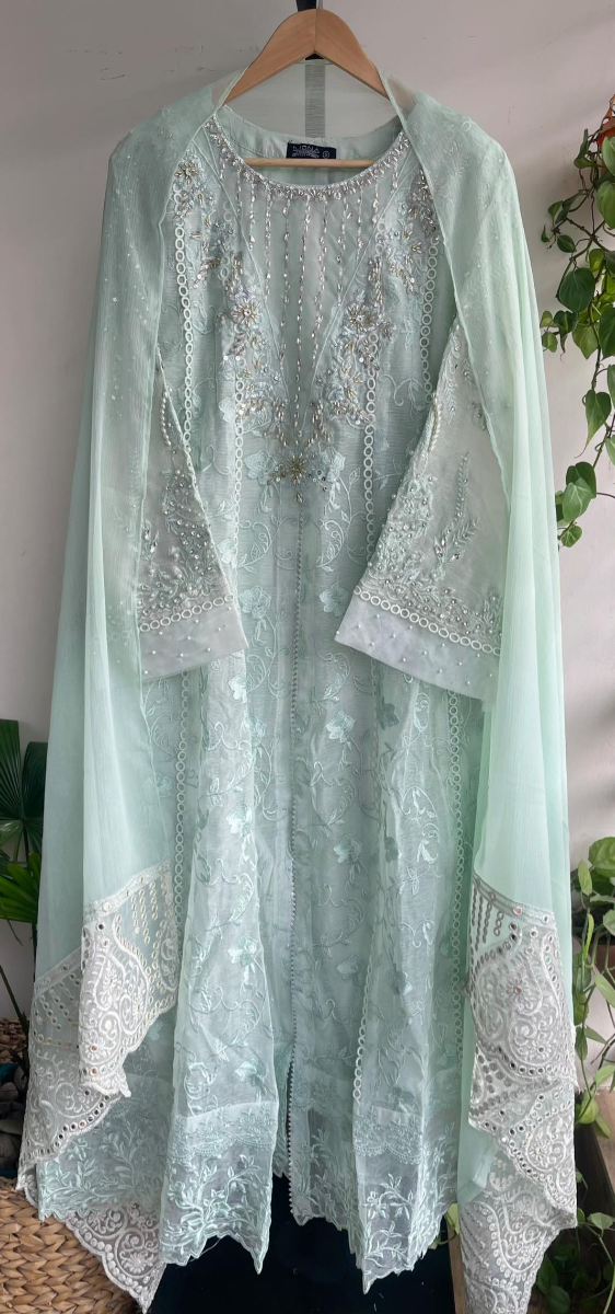 Pakistani Original Mona Embroidery Cotton Net Stitched Gown 3Pcs, Full Embroidered Shirt With Parl, Sequin, Stone Work & Embroidered Borders On Sleeves With Sequin & Parl work, & Embroidered Chiffon Dupatta & Silk Pant