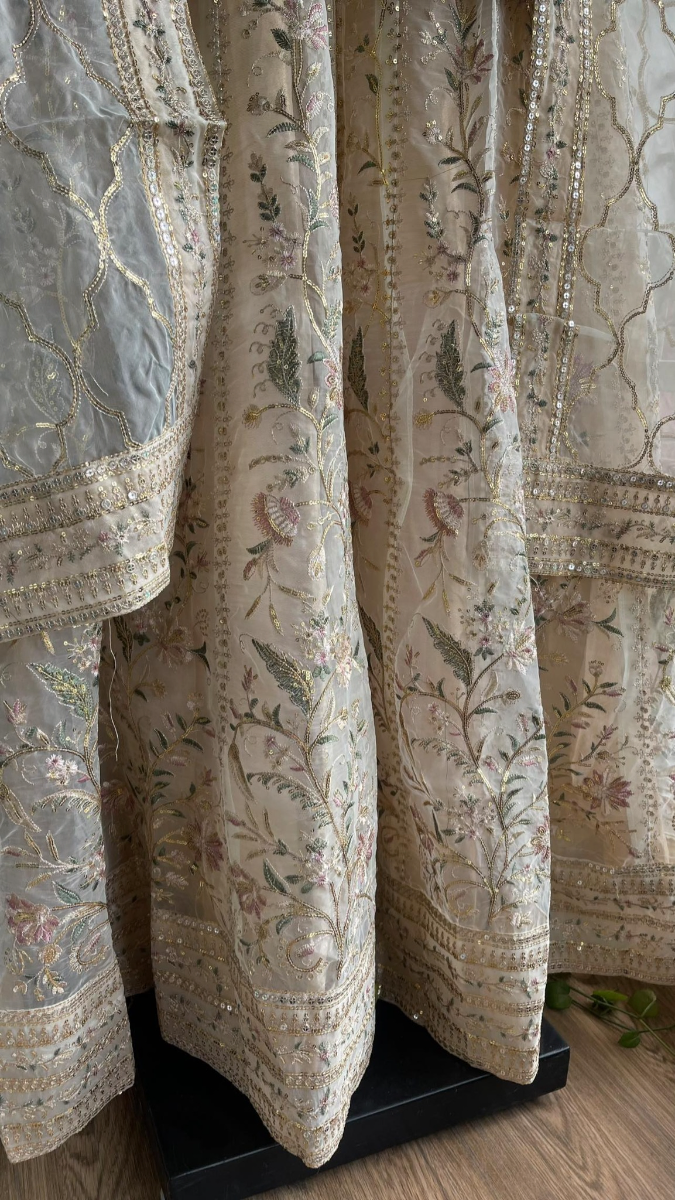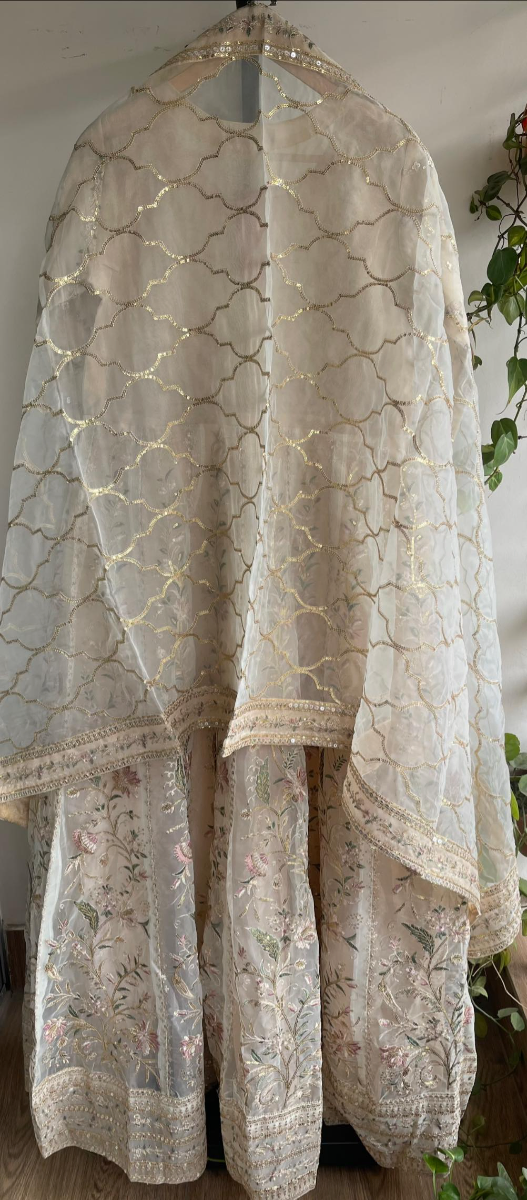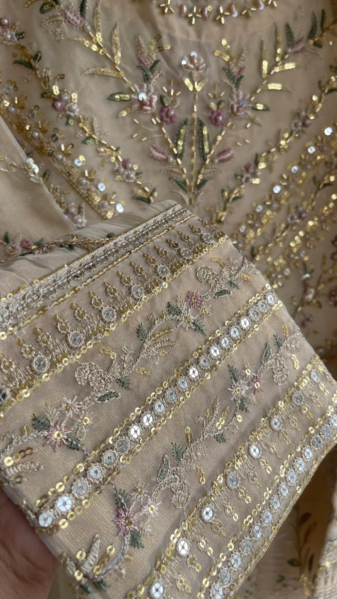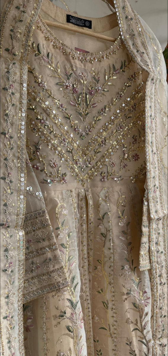 Pakistani Original Mona Embroidery Organza Stitched Gown 3Pcs, Full Embroidered Shirt With Parl, Sequin, Pipe Work & Embroidered Borders On Sleeves With Sequin & Embroidered Organza Dupatta & Silk Pant