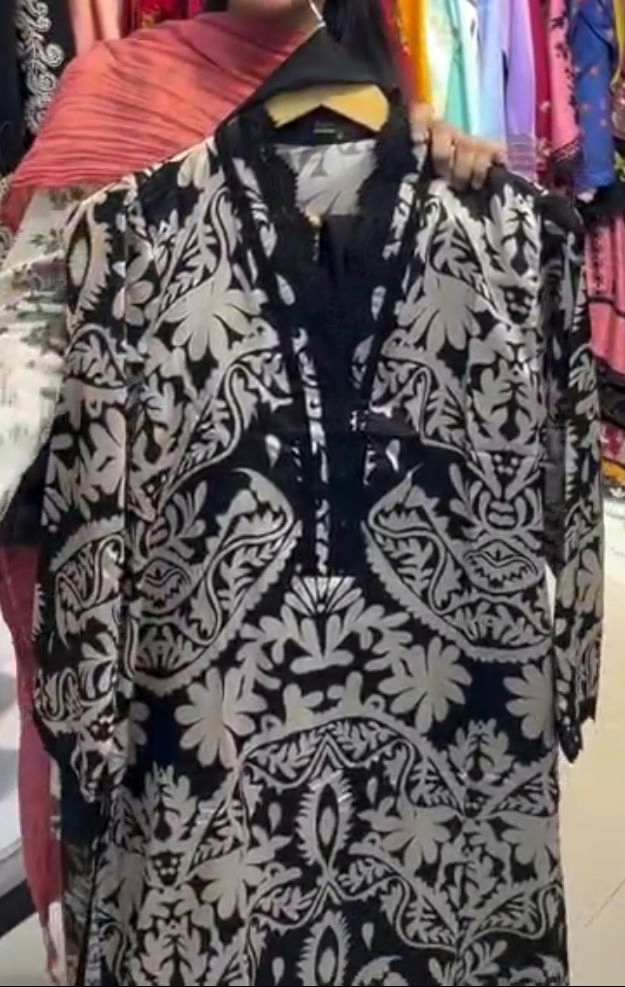 Pakistani Original Rangoon Silk Stitched 3 Pcs, Full Printed Shirt With Lase Work & Silk Dupatta & Silk Pant