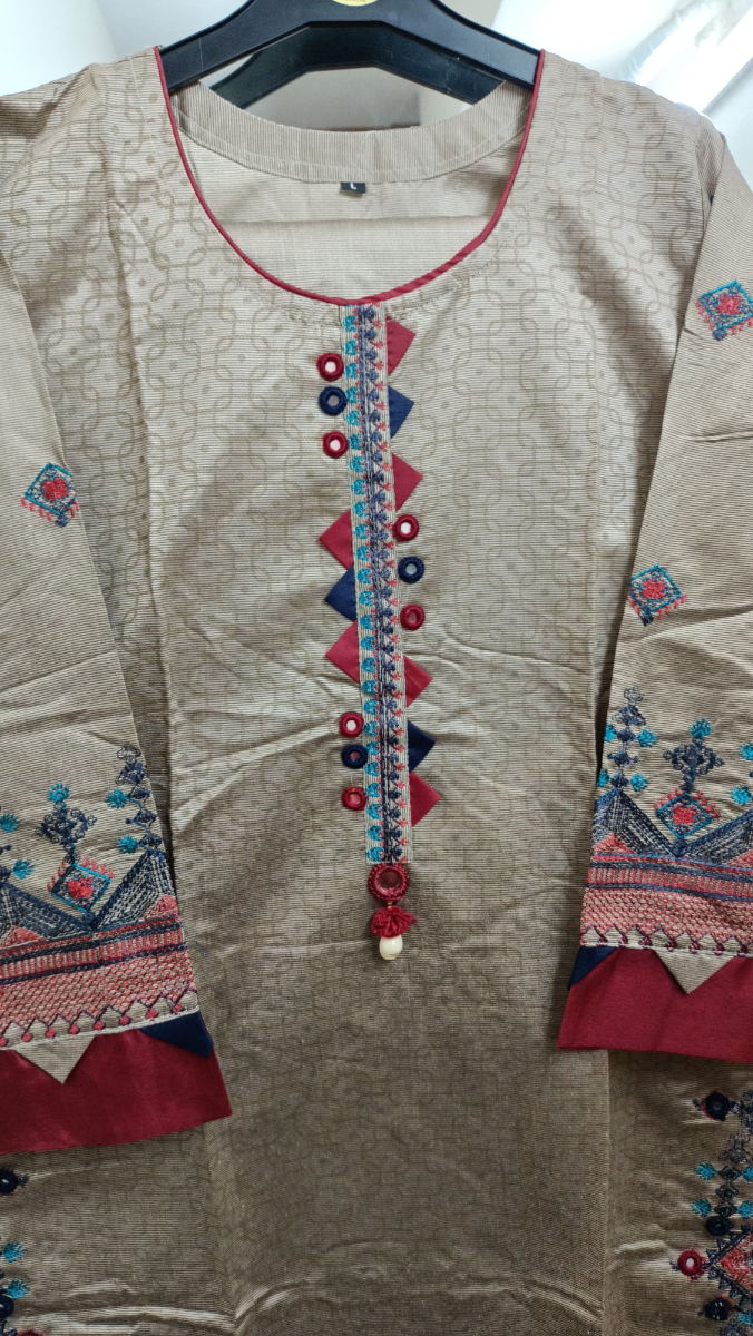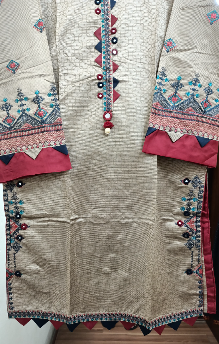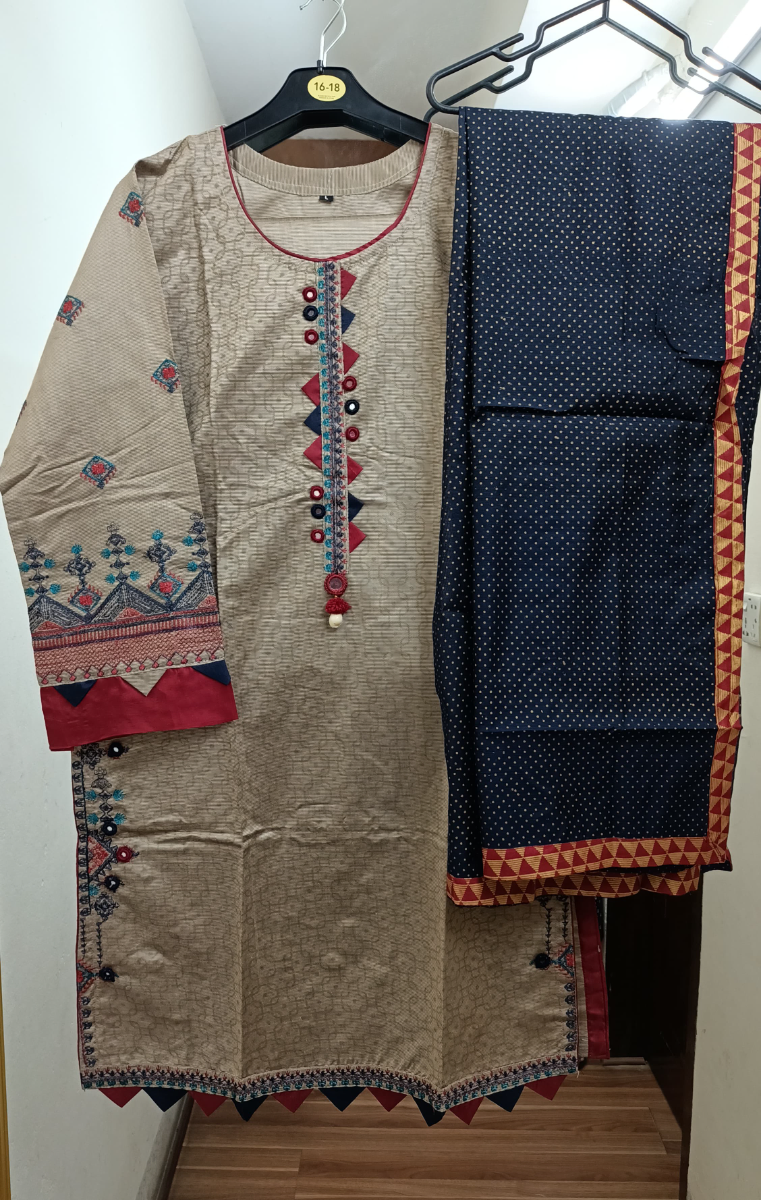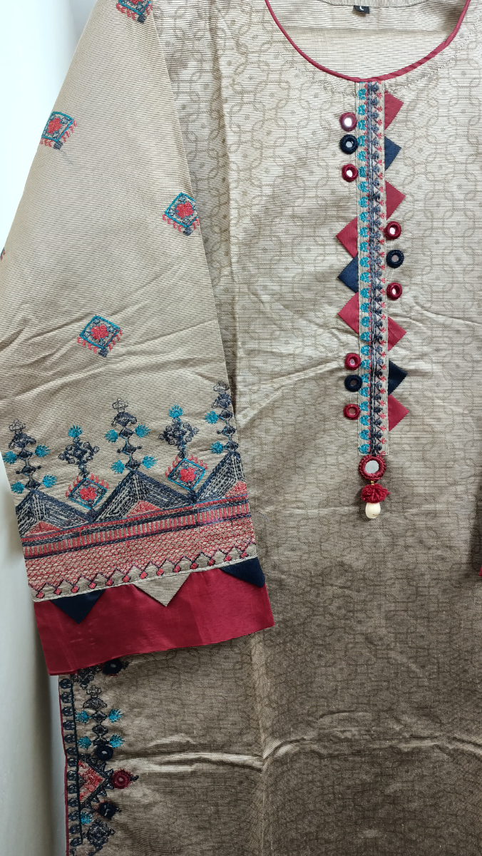 Pakistani Original Rangoon Stitched Cotton 3 Pcs, Embroidered Shirt With Mirror Work, Lasework & Embroidered Borders On Sleeves & Printed Cotton Dupatta & Embroidered Plazo Cotton Pant