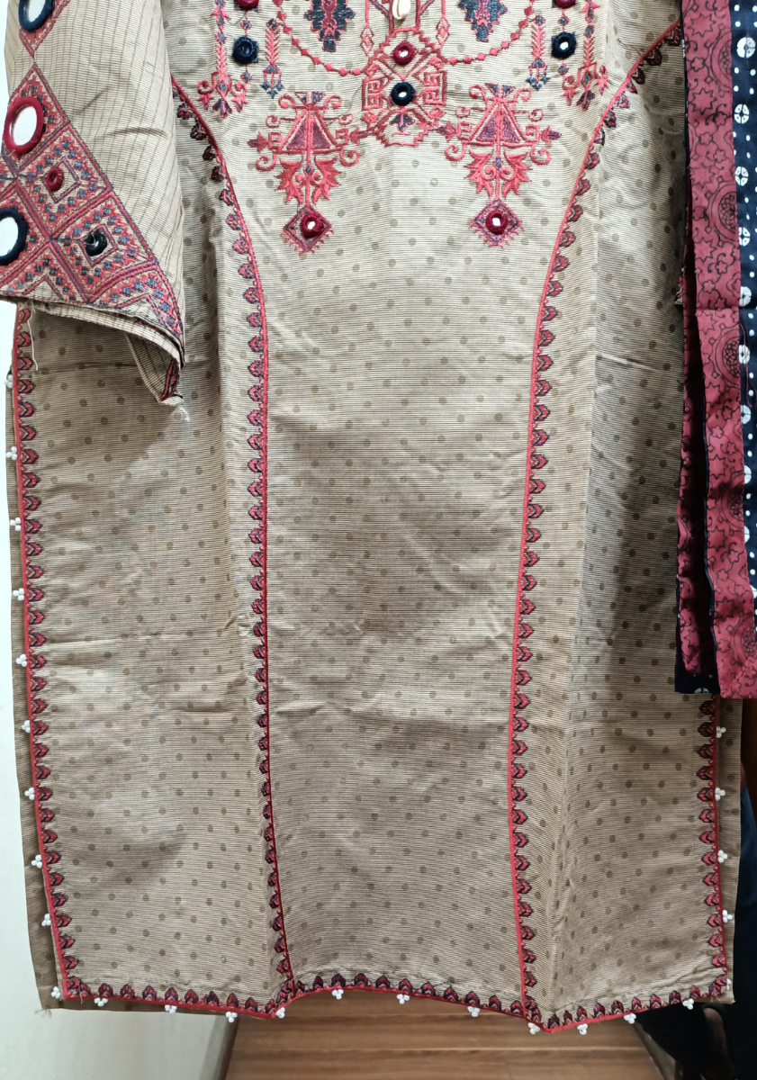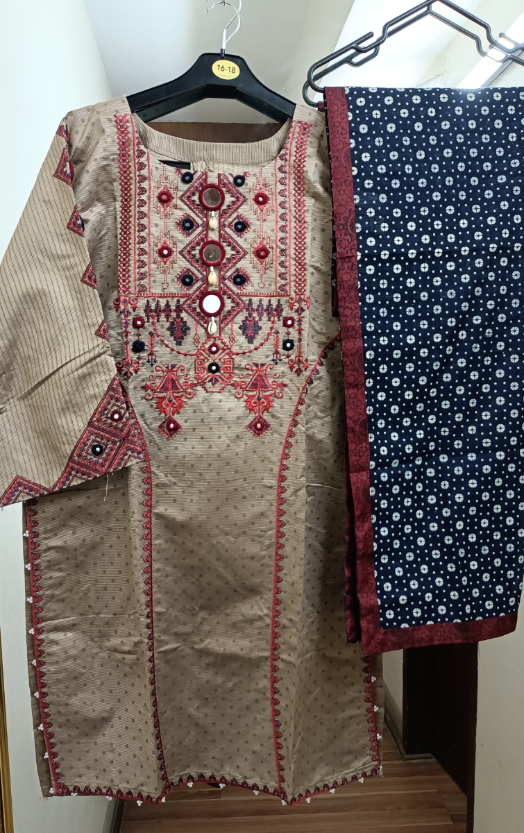 Pakistani Original Rangoon Stitched Cotton 3 Pcs, Embroidered Shirt With Mirror Work, Ston&Parl Work, Tarsel & Embroidered Borders On Sleeves & Printed Cotton Dupatta & Embroidered Plazo Cotton Pant