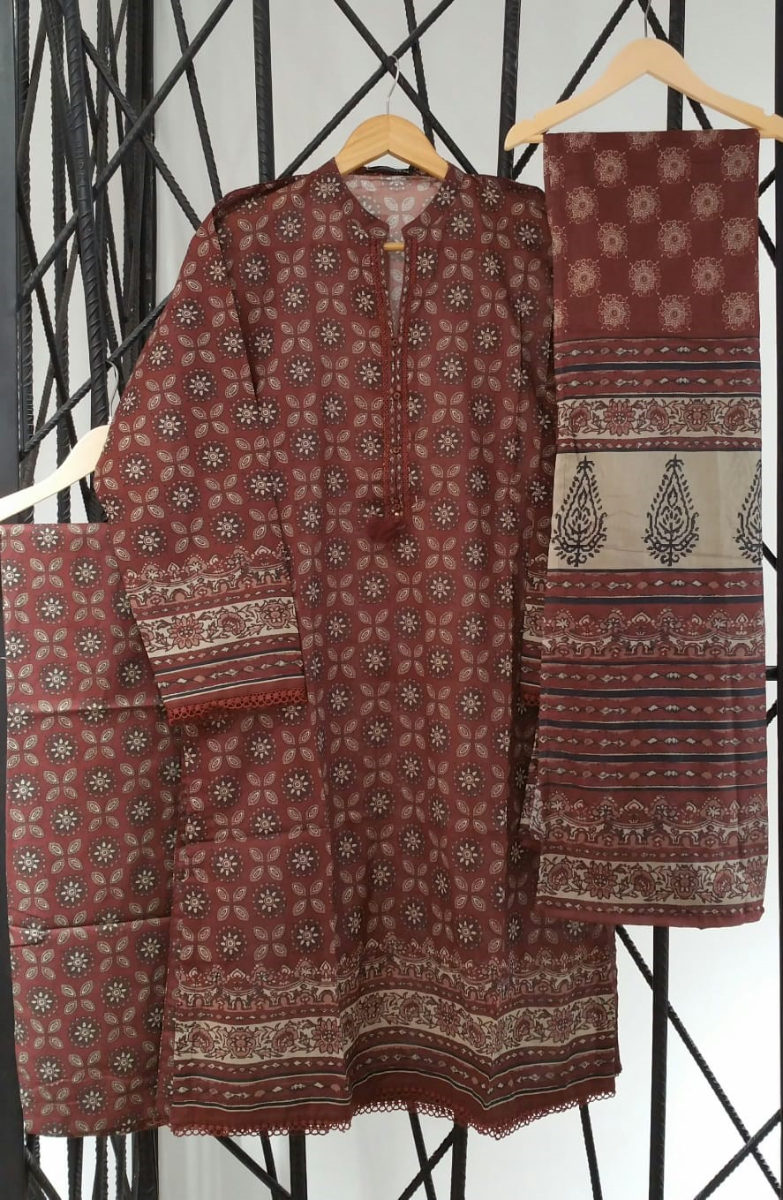 Pakistani Original Sadabahar Cotton Stitched 3 Pcs, Printed Shirt With Sequin, Parl, Stone & Embroidered & Printed Cotton Dupatta & Embroidered Borders On Sleeves & Cotton Pant