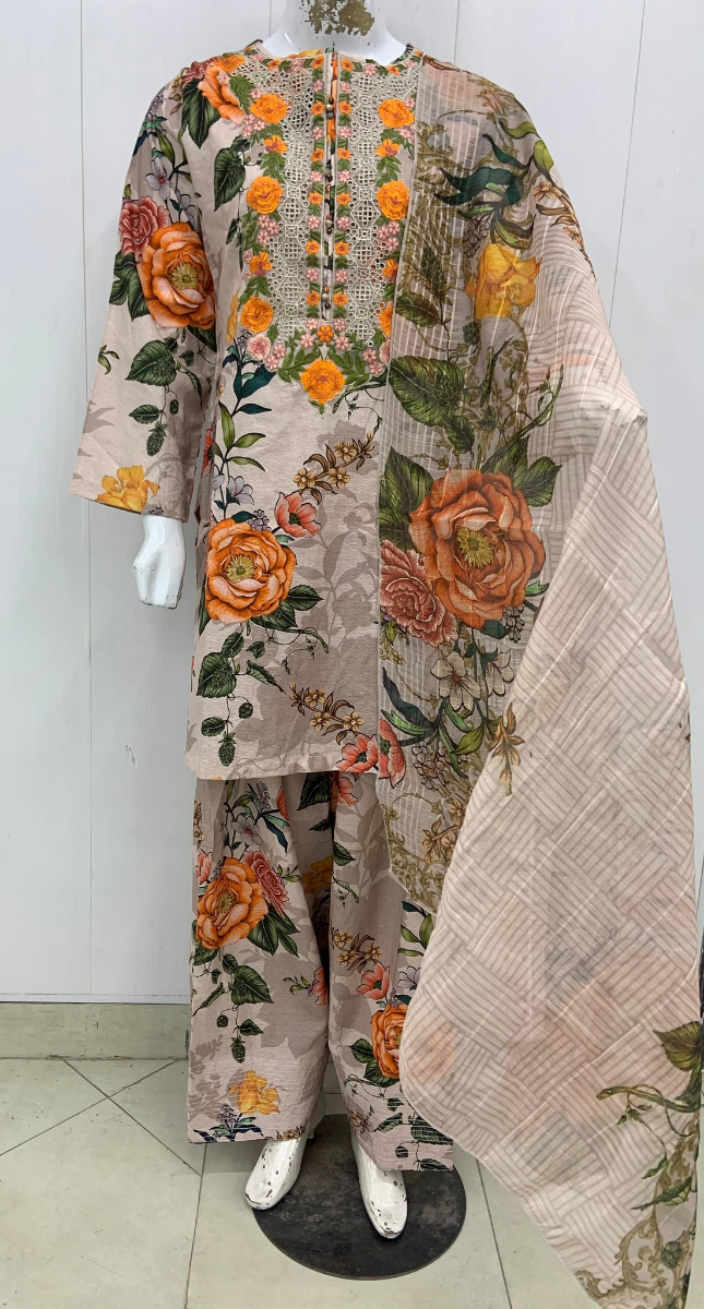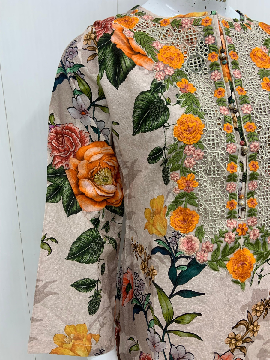 Additional Description: The Shanti is a graceful 3-piece article featuring beautiful applique work and decorated net sleeves, highlighted by a gorgeous flower print