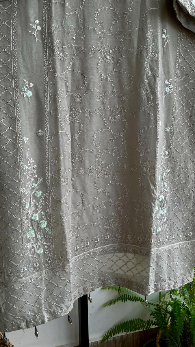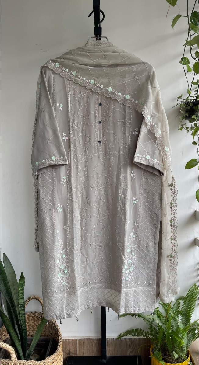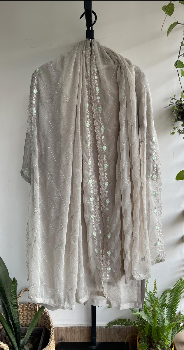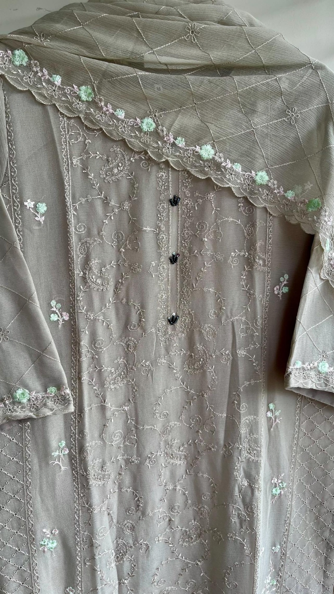 Pakistani Original Schick Chiffon Stitched 2 Pcs, Embroidered Shirt With Parl, Tassel, Neckline Ston Work & Embroidered Dupatta & Embroidered Borders On Sleeves.