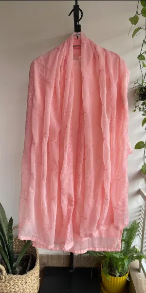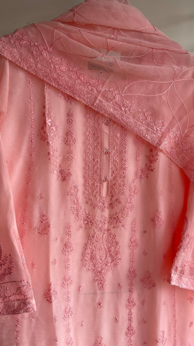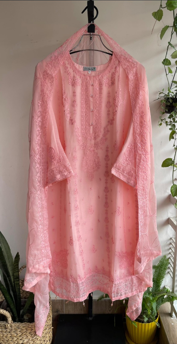 Pakistani Original Schick Chiffon Stitched 2 Pcs, Embroidered Shirt With Parl, Tassel, Neckline Ston Work & Embroidered Dupatta & Embroidered Borders On Sleeves.