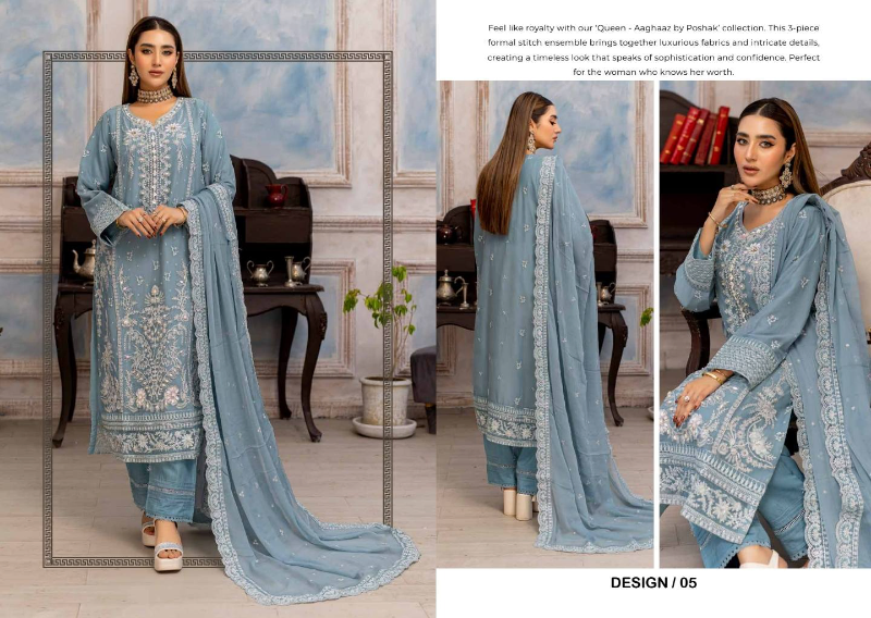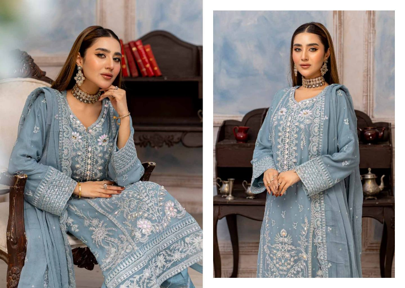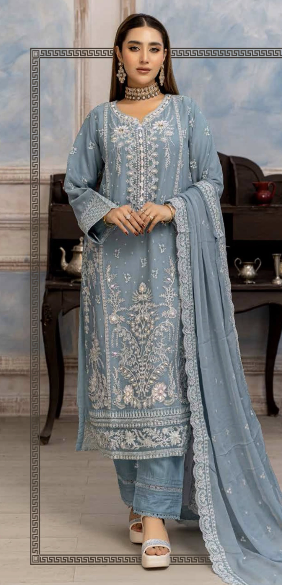 Pakistani Poshak Luxury Chiffon Stitched 3Pcs, Embroidered Shirt With Sequin, Stone, Parl & Embroidered Chiffon Dupatta & Embroidered Borders On Sleeve & Silk Pant