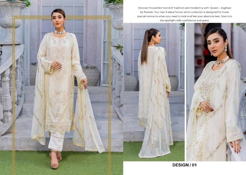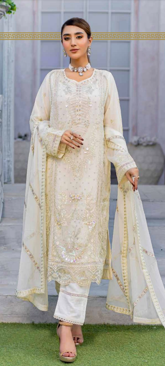 Pakistani Poshak Luxury Chiffon Stitched 3Pcs, Embroidered Shirt With Sequin, Pipework, Parl & Embroidered Chiffon Dupatta & Embroidered Borders On Sleeve & Silk Pant