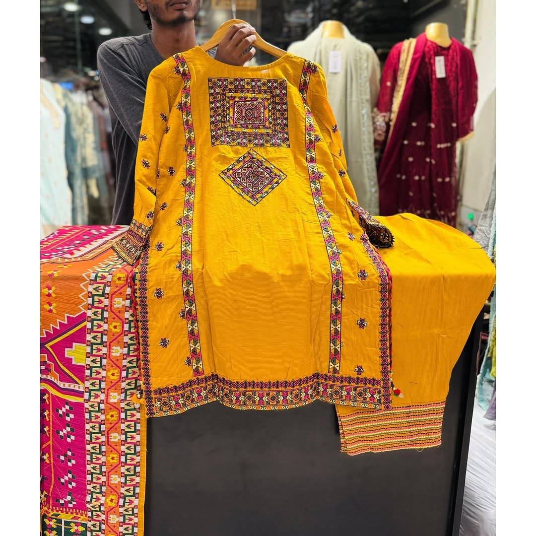 Pakistani Rangoon Stitched Cotton 3pcs, Embroidered Shirt With Sequin, Tassel, Mirror Work & Embroidered Borders On Sleeves & Cotton Dupatta & Cotton Pant