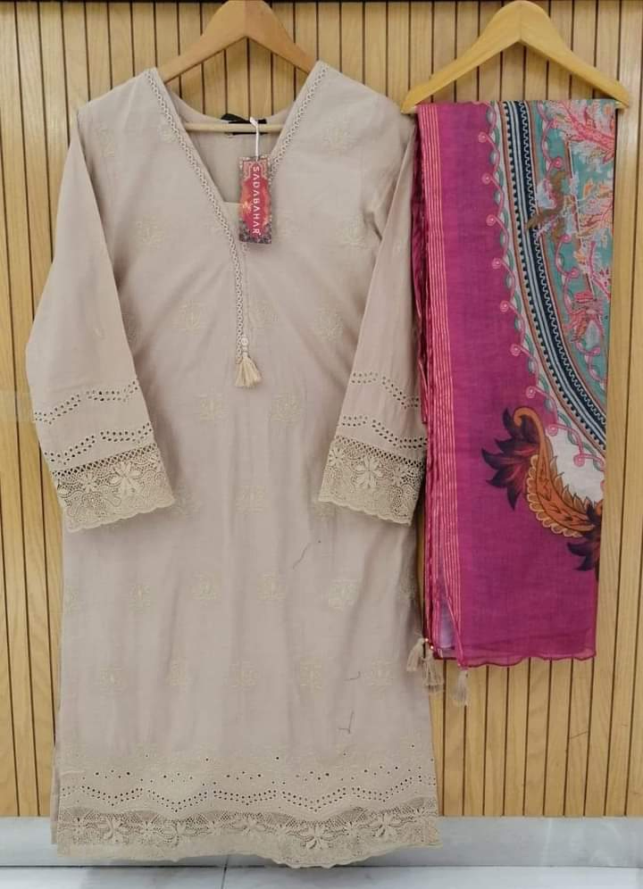 Pakistani Sadabahar Chichenkari Stitched 3Pcs, Full Embroidered Shirt With Chichenkari Work, Sequin, Parl, Tassel, Lacework & Printed Maysori Cotton Dupatta & Chichenkari Embroidered Borders On Sleeves & Cotton Pant