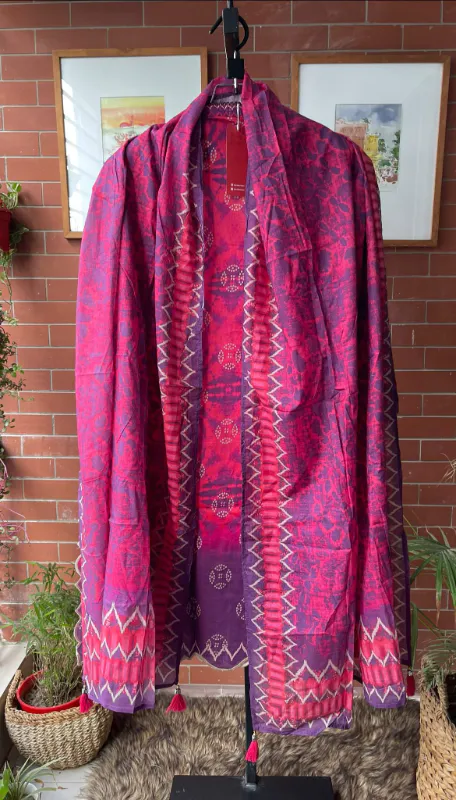 Pakistani Sadabahar Printed Cutwork Stitched 3Pcs, Full Printed & Embroidered Cutwork Shirt With, Parl, Tassel & Printed Cotton Dupatta & Embroidered Borders On Sleeves & Cotton Pant