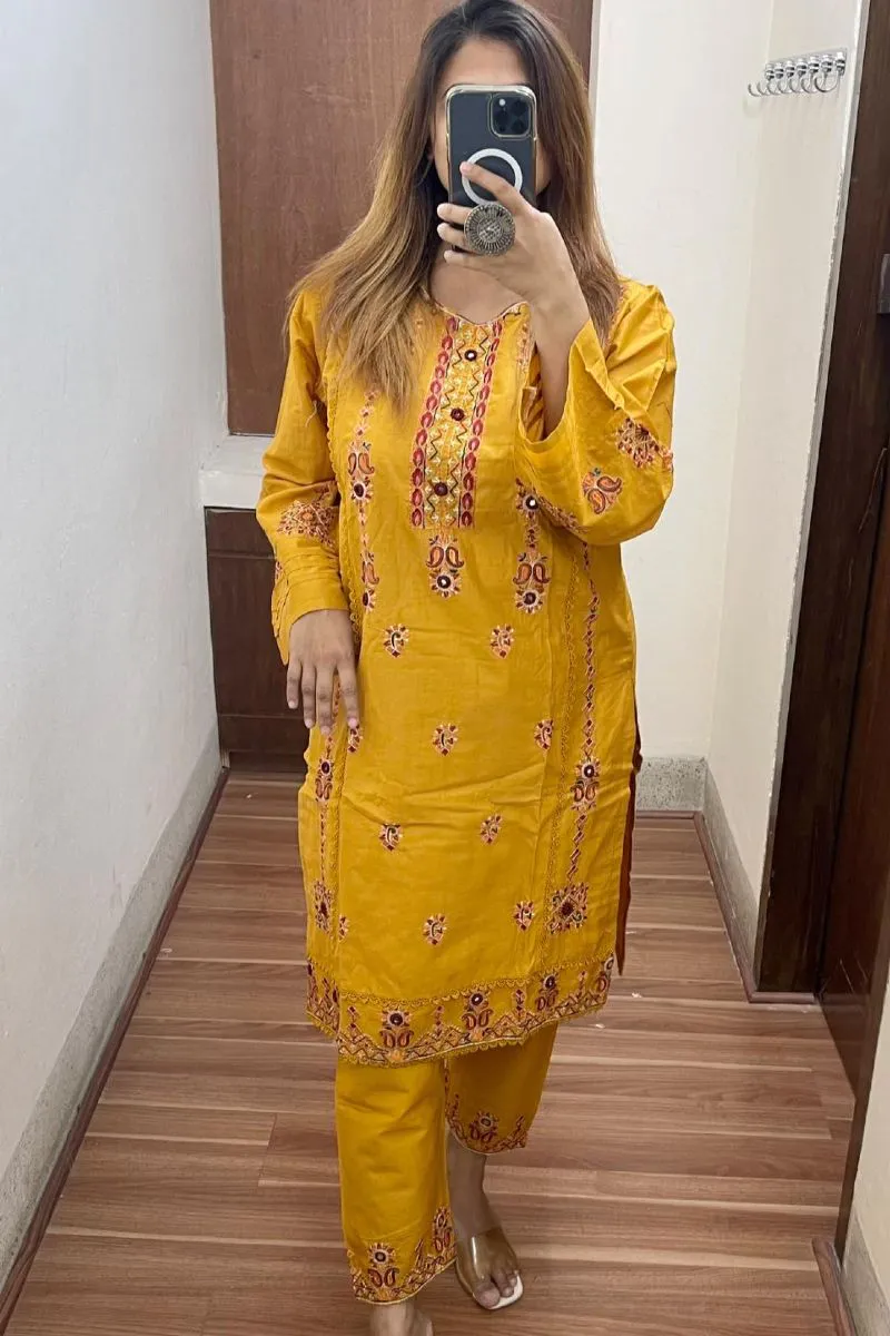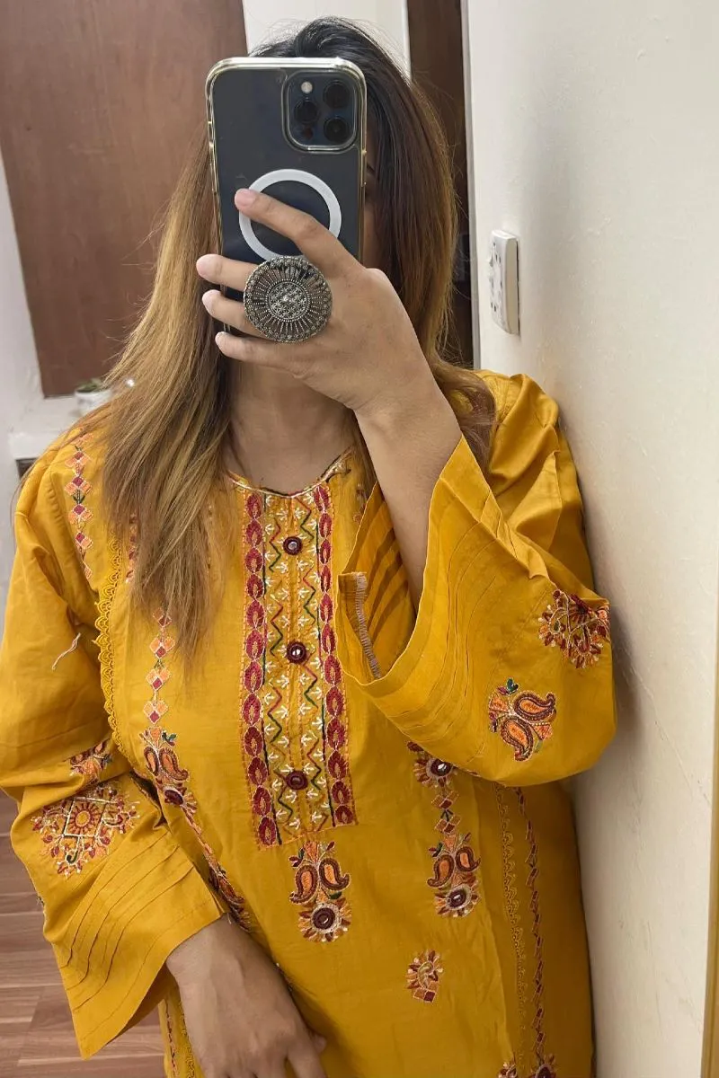 Pakistani Hayat's Stitched Cotton 2pcs, Embroidered Shirt Lacework, Mirror Work With Embroidered & Borders On Sleeves & Pant