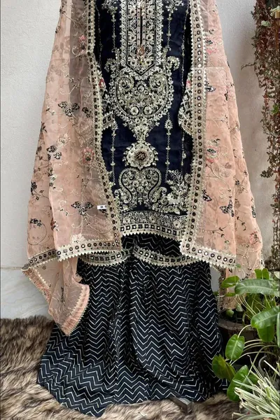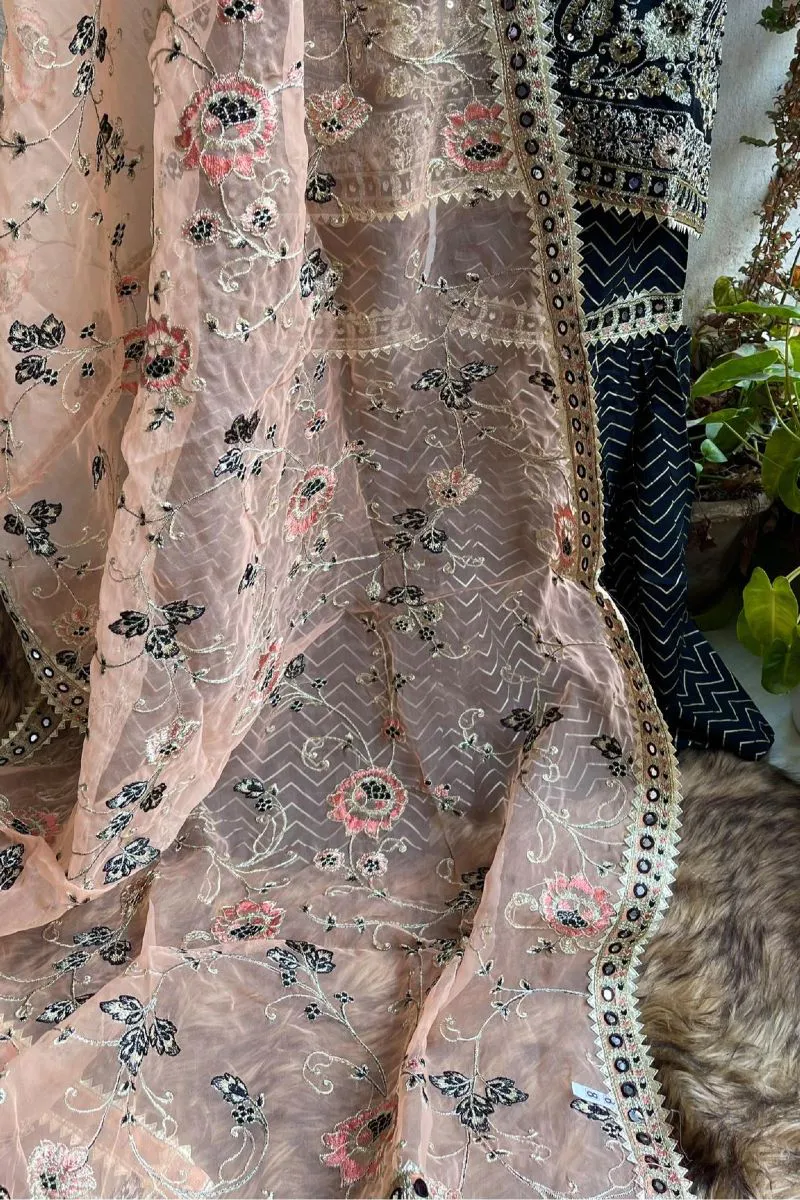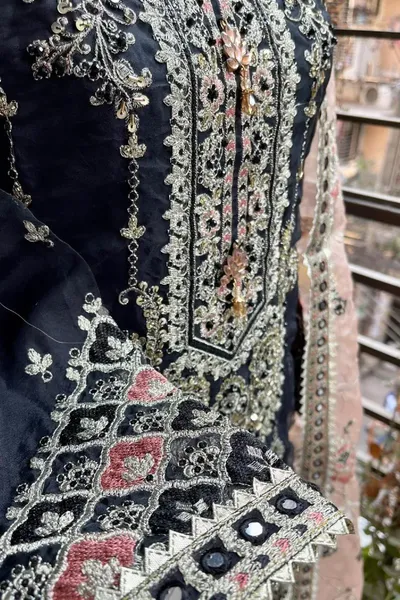 Pakistani Hayat's Stitched Organza 3pcs, Embroidered Shirt Stone, Pipework, Sequin, Parl, Lacework, Mirror Work With Embroidered Dupatta with Mirror Work & Embroidered Borders On Sleeves, Mirror Work Garara Pant