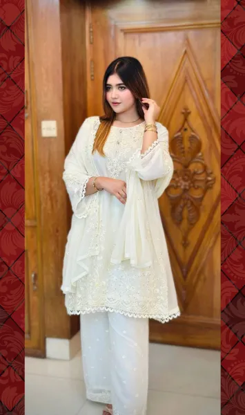 Rangoon Frock style Chiffon Stitched 3 Pcs With Palazzo, Embroidered Shirt With Parl,Ston,Sequne Work Pipe Work & Embroidered Chiffon Dupatta & Embroidered Borders On Sleeve & Chiffon Palazzo Pant