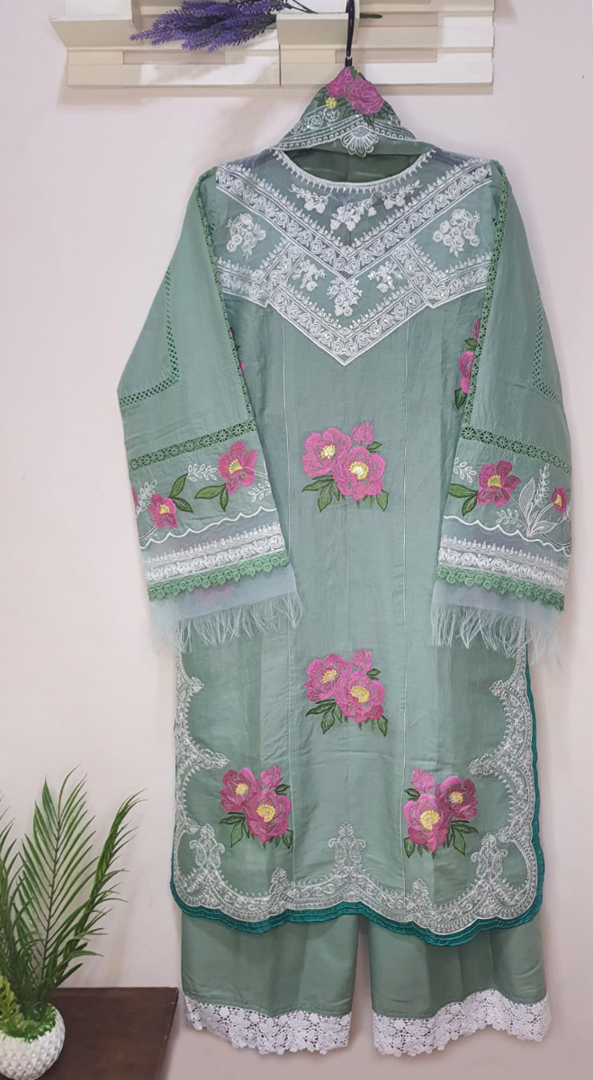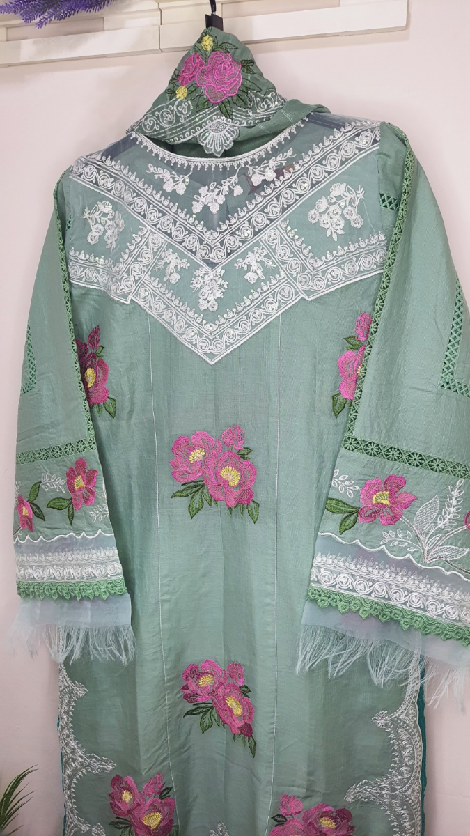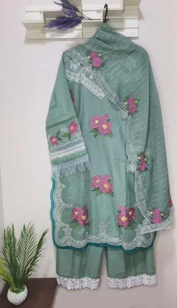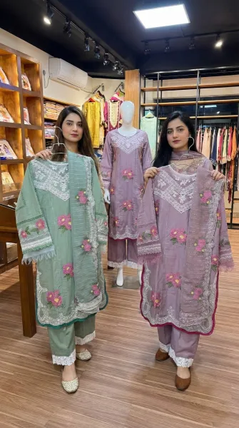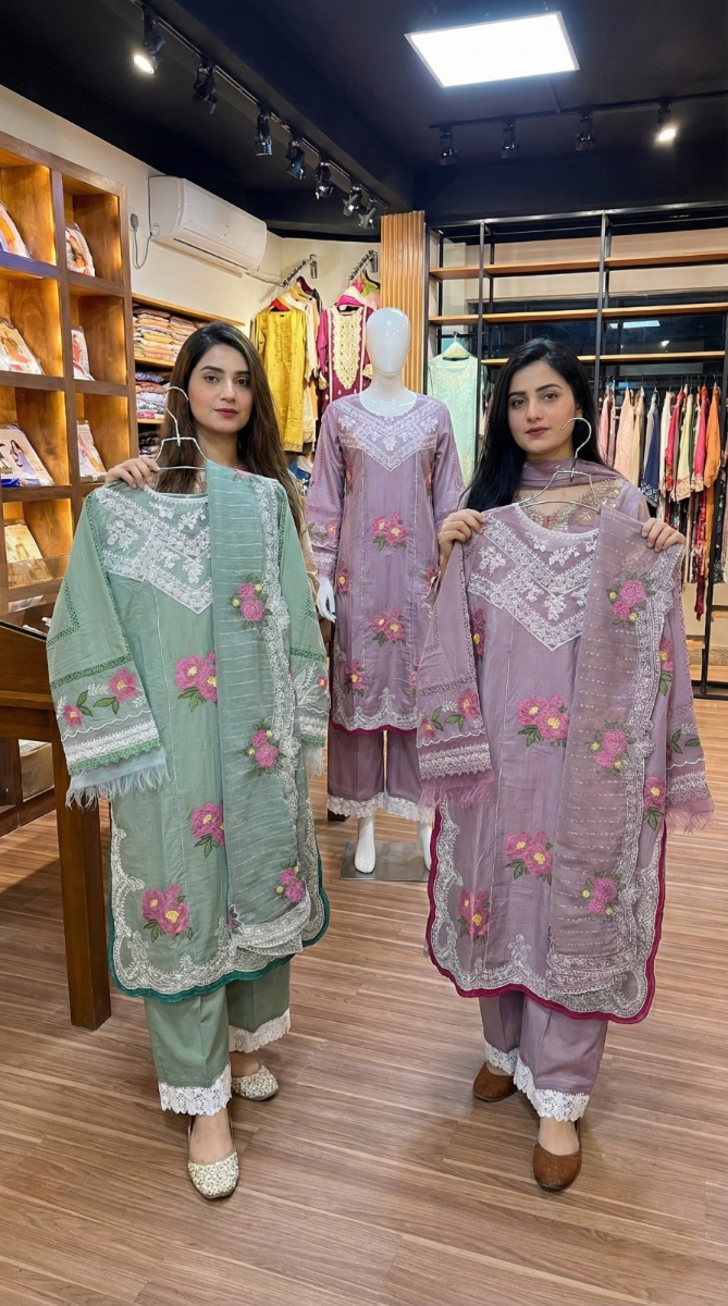 Stylish Attire Prime Ethereal Rose Set 3Pcs, Embroidered Shirt With Sequence work, Embroidered work & Lacework & Embroidered Borders On Sleeves & Embroidered Dupatta- Soft Organza & Cotton Mixed Fabric & Pant Cotton Fabric